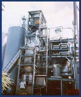 Aus einem Vorratsbunker auf einem Gestell wird das Holz bzw. werden die Holzabfälle automatisch zum Heißgaserzeuger transportiert. Dieser fördert das Heißgas mit einer Temperatur von 900°C zum Dampferzeuger. Im Dampferzeuger wird durch das Heißgas überhitzter Dampf mit einem Druck von 28 bar und einer Temperatur von 350°C erzeugt. Die Turbine hat eine Leistung von 2.6 MW/h. Das Heißgas tritt mit einer Temperatur von 200°C aus dem Dampferzeuger. Ein nachgeschaltetes Abgasreinigungsystem gewährleistet, daß die Abgaswerte den örtlichen, behördlichen Vorschriften entsprechen. |